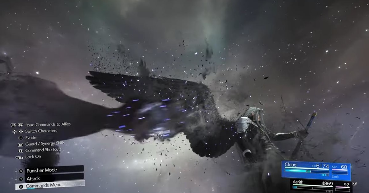 Cloud gets absorbed into a universe where Aerith is seemingly still thriving, and battles Sephiroth alongside her. At the same time, Zack gets pushed into a world where nothing is left but Aerith’s church, hanging in a void. The rest of the party also jumps through the portal to help, before seeing Aerith and Cloud seemingly vanish. Each of the three groups begins battling an incarnation of Sephiroth and Jenova, and as each group does damage, those effects become visible in the Sephiroth of each world.