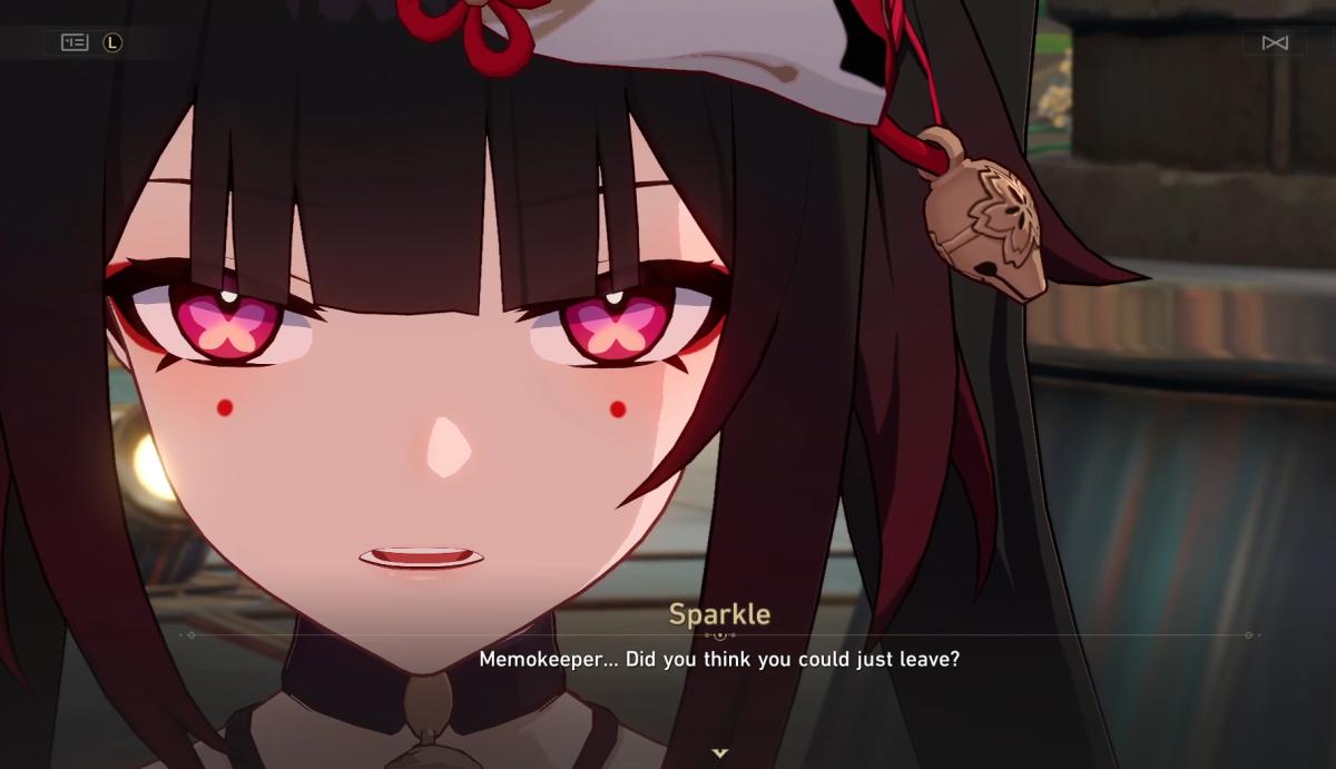 She declines an alliance with Aventurine, telling him she doesn’t work with IPC lapdogs and that not playing the game at all is the smartest move. Instead, she asks Black Swan for an alliance after playing an elaborate prank on her, saying they should both work behind the scenes of this “show of unprecedented splendor” and observe it from the best seats in the house. Black Swan refuses, revealing that she knows that Sparkle is by no means working alone and has been hired by someone to come to Penacony (someone who may not appreciate Sparkle looking for other alliances). Sparkle also tries to get an alliance with Sunday going, offering to stand in for the deceased Robin at events, but is once again rebuffed.